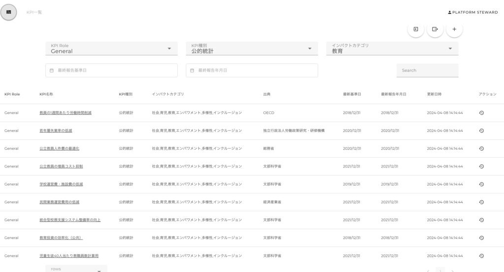 各KPIに対し、統計やデータの紐付けが可能です。推計が必要なケースにおいては、算出式の設定および算出のためのデータの紐付けが可能です。