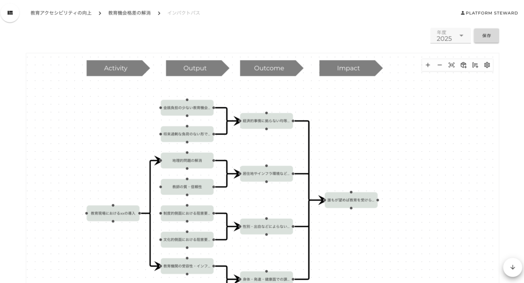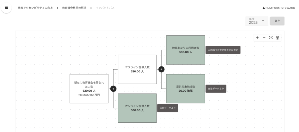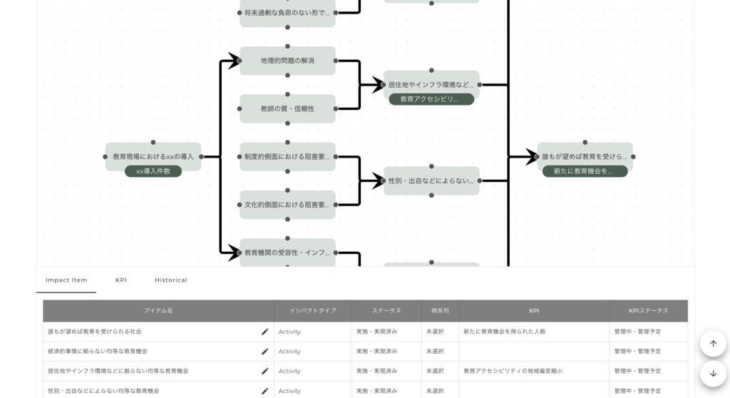 本機能では、ユーザーは特定の事業や取組が創出する幅広いテーマの社会的インパクトについて、幅広いユーザーが最低限の一般的なフレームワークやスタンダードに則りその計画や測定(評価)を有意義な形で実施するためのプロセスを提供します。