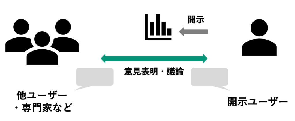 ユーザー(主に情報開示者・情報所有者)は特定のインパクトに関する情報について、プラットフォーム上で意見交換する場を設定できます。これは、ユーザーにとっては当該情報に対して積極的かつ詳細に捕捉できる機会になると同時に、有識者や外部からのフィードバックを通じて情報の信頼性を高め、より良い計測方法についての知識を得ることにつながります。一方で、ユーザー以外のフォーラム参加者にとっても、情報に対する理解を深めたり、自身の専門性などを活用しコミュニティに貢献したりする機会となります。 フォーラムは、情報を有するユーザーが自身で、あるいは閲覧者からのリクエストを受けて承諾する場合(拒否も可能)において立ち上げられ、ユーザーによってクローズ可能です。また、この意見交換に参加できるユーザーはユーザー種別(詳細は「ユーザーの種別」を参照)単位で設定可能で、フォーラムを立ち上げるユーザー自身が設定・変更できます。
